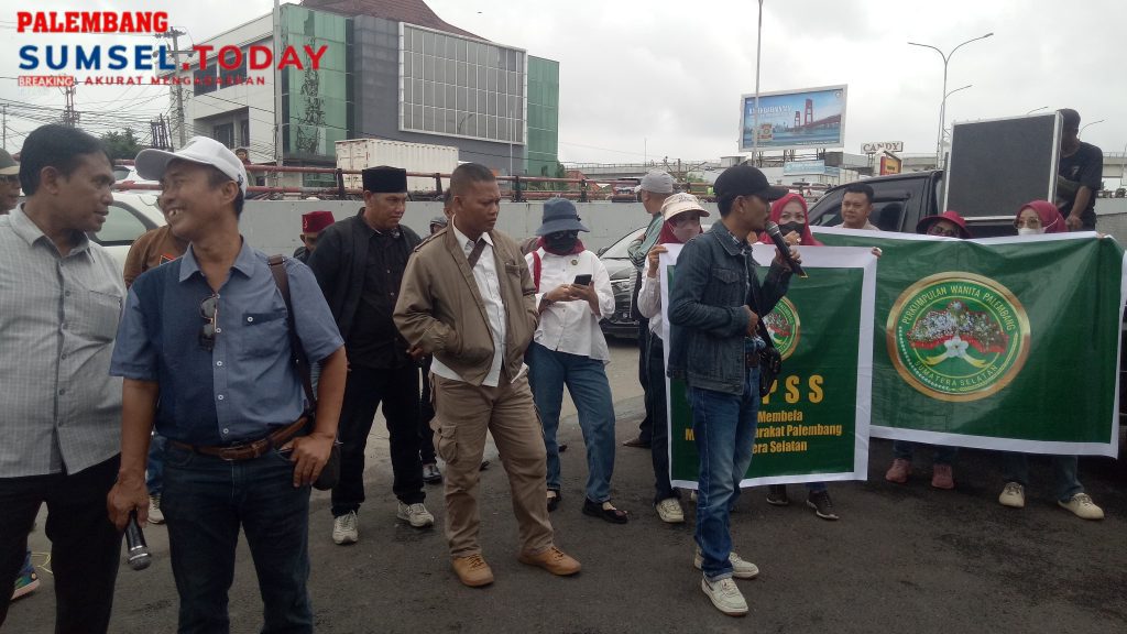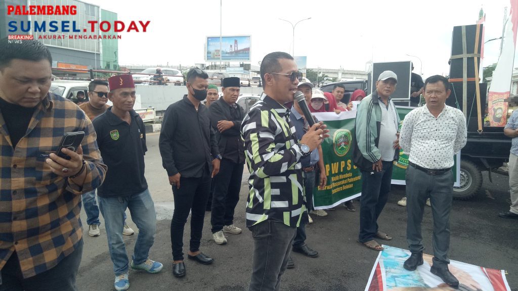 Dalam aksi tersebut, para demonstran membawa spanduk besar yang bertuliskan, “Tangkap Willy Salim, Konten kreator yang merusak nama baik Palembang demi kepentingan kontennya.”