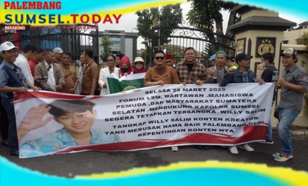 Dalam aksi tersebut, para demonstran membawa spanduk besar yang bertuliskan, “Tangkap Willy Salim, Konten kreator yang merusak nama baik Palembang demi kepentingan kontennya.”