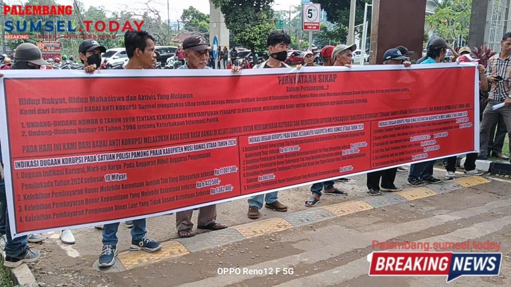Puluhan massa dari organisasi BADAI ANTI KORUPSI Sumatera Selatan (Sumsel) menggelar aksi unjuk rasa damai di depan Kejaksaan Tinggi (Kejati) Sumsel, Senin pagi. Dalam aksi tersebut, mereka menyampaikan aspirasi sekaligus menyerahkan laporan resmi dugaan indikasi korupsi di sejumlah Organisasi Perangkat Daerah (OPD) Kabupaten Musi Rawas Utara (Muratara) tahun anggaran 2024.Selasa,(11/11/2025)
